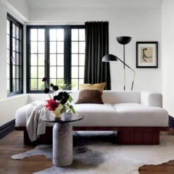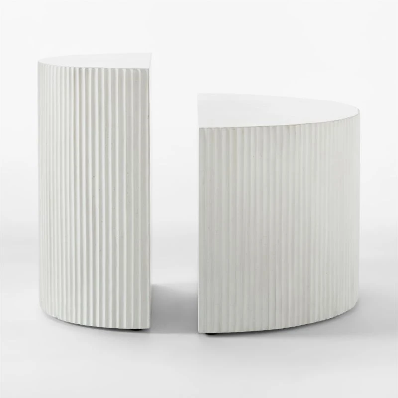 Designed by Melbourne-based studio VUUE and inspired by the Greek isles, crafted stone cast half-circle table is reminiscent of a column thanks to fluted details. An opaque ivory glaze lends it the dreamy appeal of a reactive, milky ceramic piece. Alone, it serves well as a small drinks table, or group two together to create a coffee table suitable for indoors or outside. CB2 exclusive.