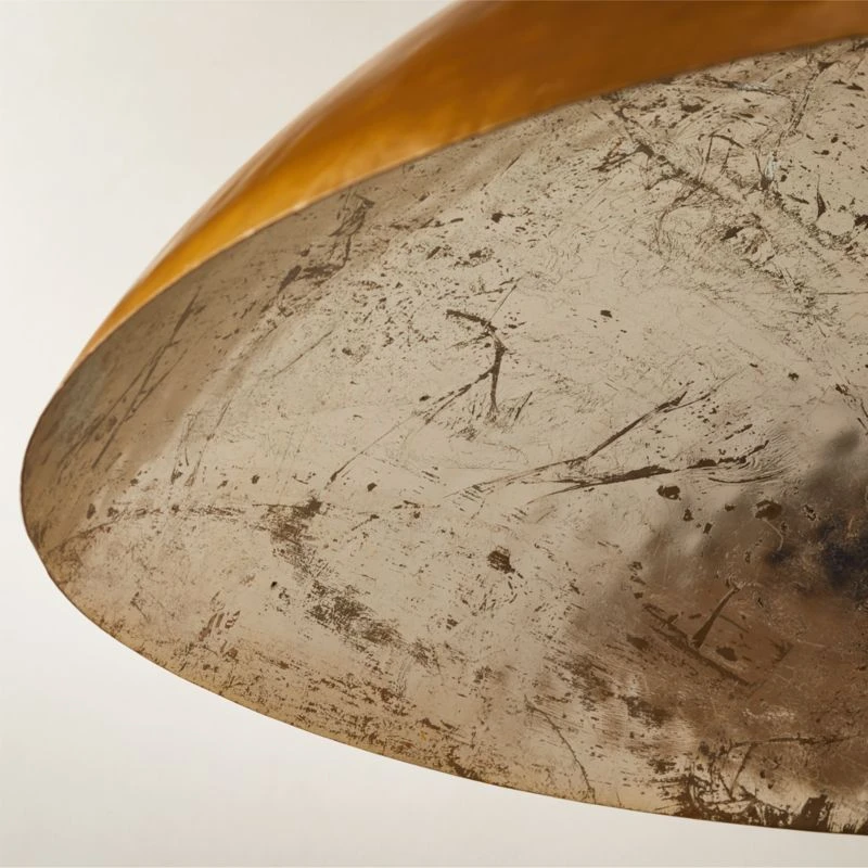 Hammered by hand, brass pendant light mixes metallic tones to gorgeous effect. Shade exterior is plated with warm brass; inside, textured silver foil shimmers as it reflects light downward to the table, bar or counter. CB2 exclusive.