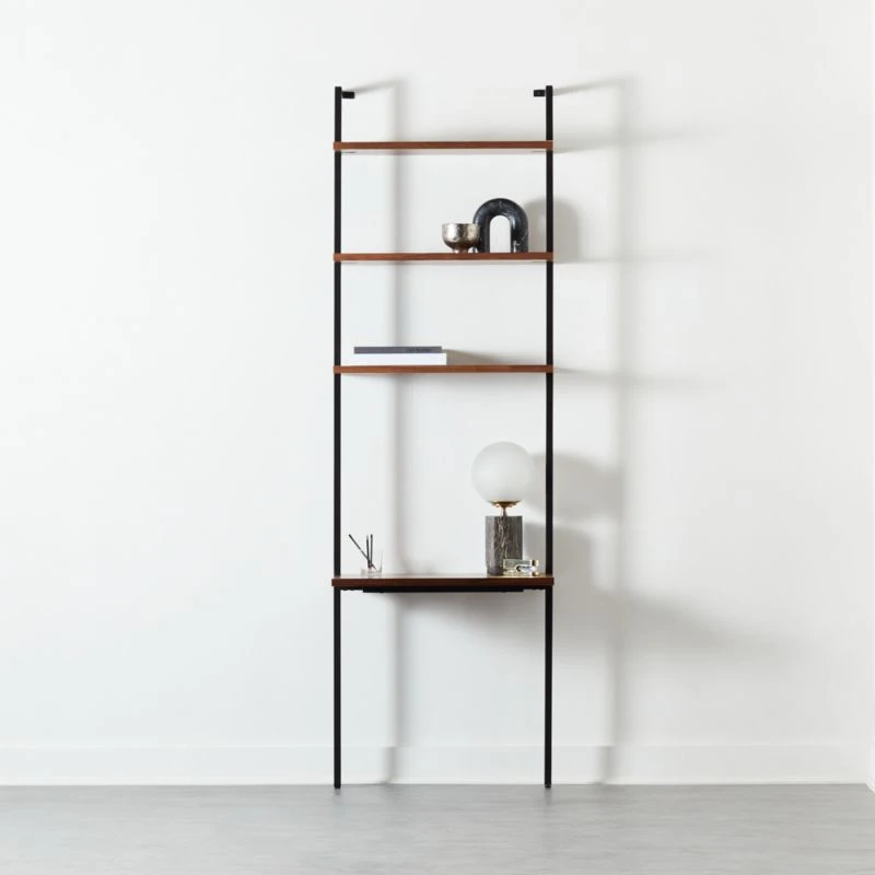 Party on top, business on the bottom. Three fixed walnut veneer shelves pan out in a powdercoated metal frame. Modularly designed to pull double duty as a display/work space and looks even better standing next to our Helix walnut bookcase. Stud mounting recommended; hardware included for drywall installation. CB2 exclusive.