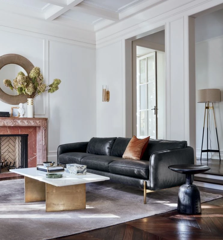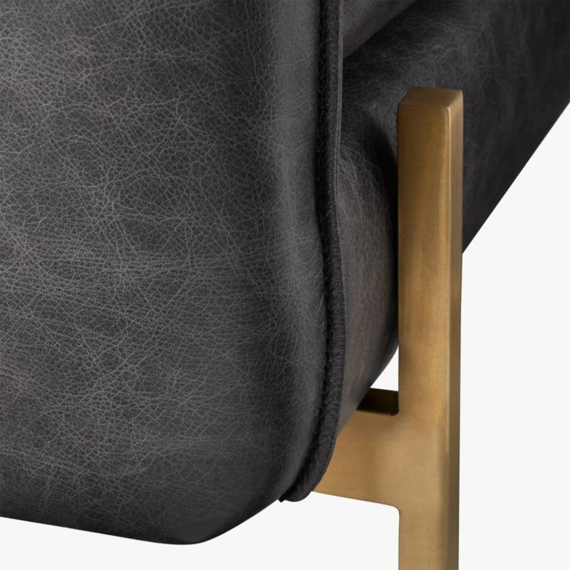 The standard sofa stretches out on a modern frame wrapped in rich black leather. Designed by James Patterson, the sofa’s slim, discreet profile is edgy and sleek. Brushed brass finished legs squarely support the generous seat, upholstered in dark leather that will continue to patina with character over time. Learn more about James Patterson on our blog.