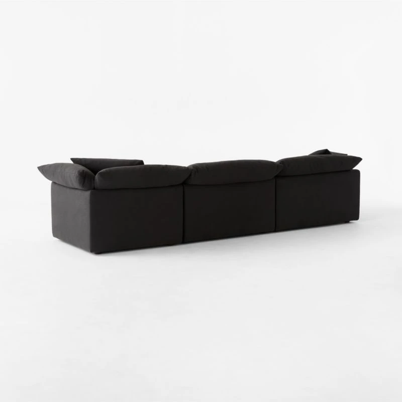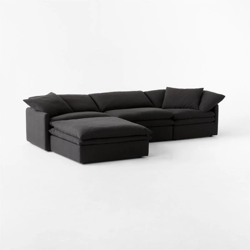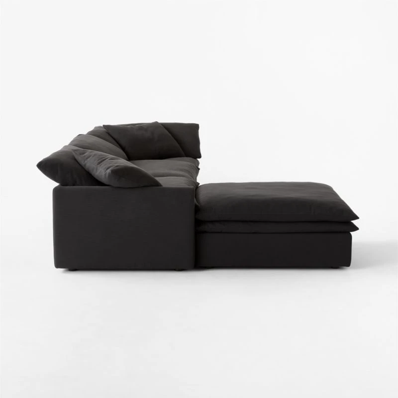 Low, oversized linen sectional sofa is casually chic while maximizing comfort.. Double-stacked pillowy seat and loose cushions throughout are upholstered in a charcoal black easy-care performance linen blend, creating an unbelievably soft place you’ll never want to leave. Combine it with other Mattea pieces to create a sectional to fit your space. CB2 exclusive.