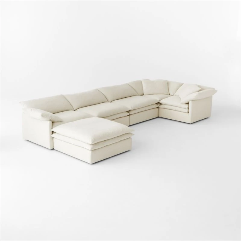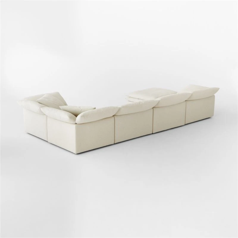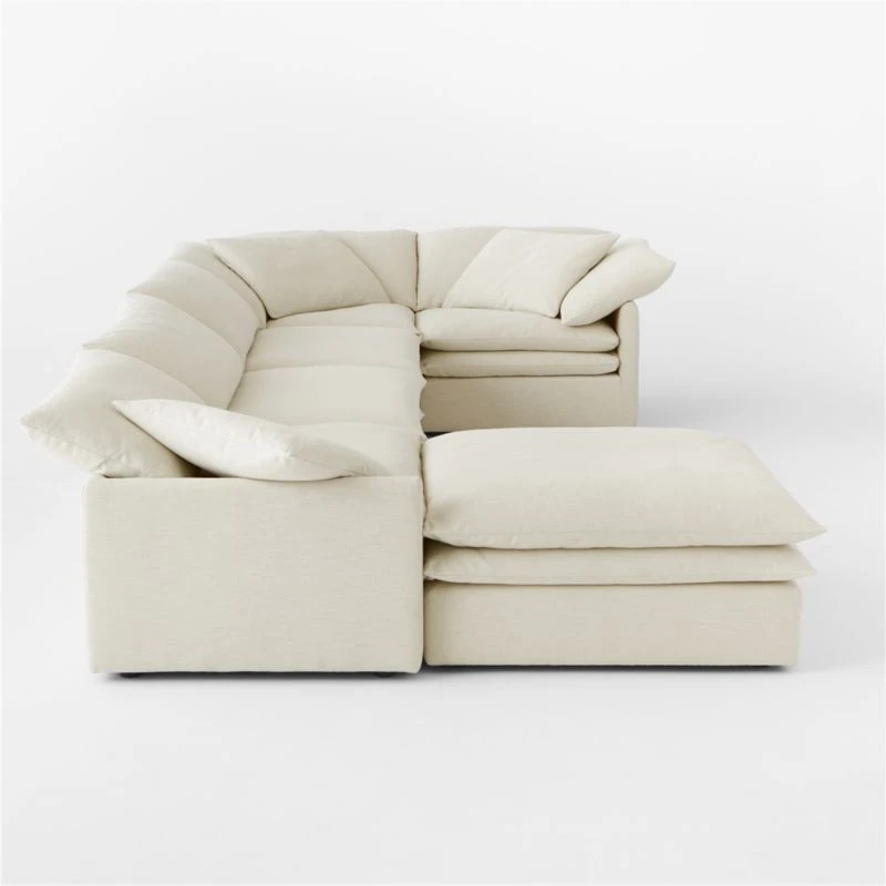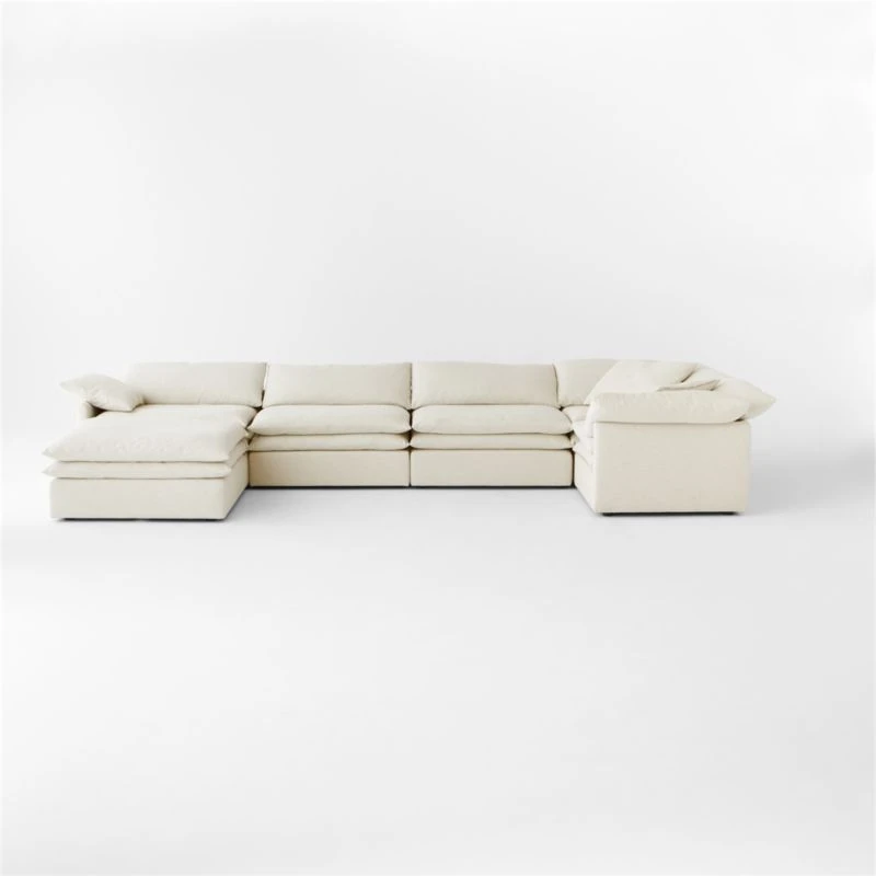 Low, oversized linen sectional sofa is casually chic while maximizing comfort.. Double-stacked pillowy seat and loose cushions throughout are upholstered in a natural-toned, easy-care performance linen blend, creating an unbelievably soft place you’ll never want to leave. Combine it with other Mattea pieces to create a sectional to fit your space. CB2 exclusive.