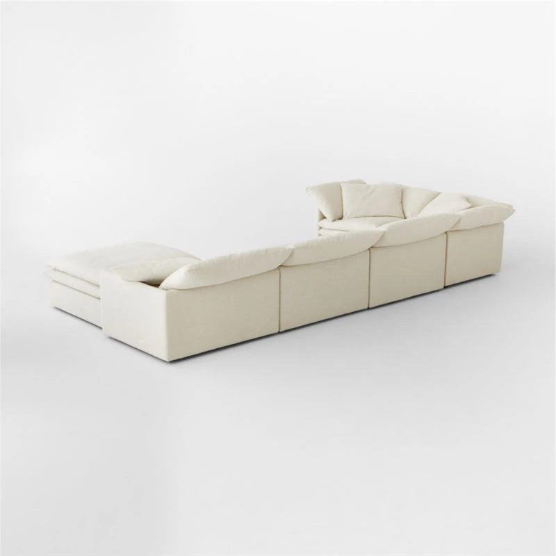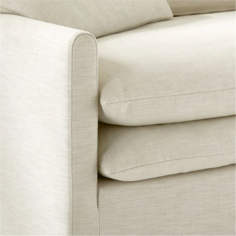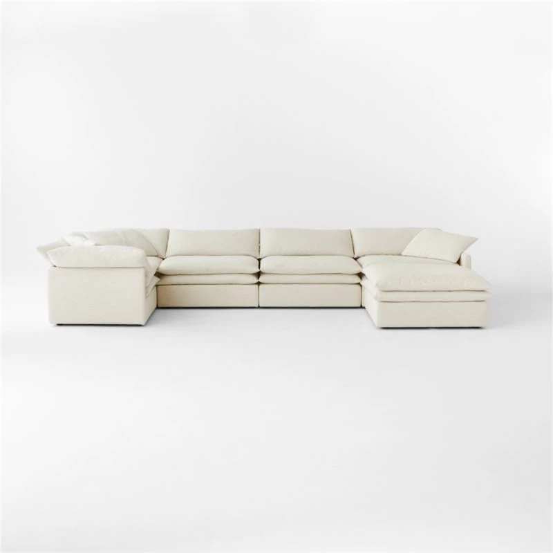 Low, oversized linen sectional sofa is casually chic while maximizing comfort.. Double-stacked pillowy seat and loose cushions throughout are upholstered in a natural-toned, easy-care performance linen blend, creating an unbelievably soft place you’ll never want to leave. Combine it with other Mattea pieces to create a sectional to fit your space. CB2 exclusive.