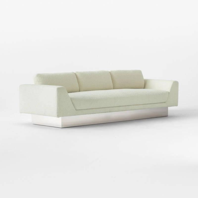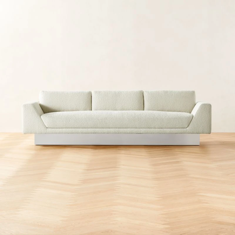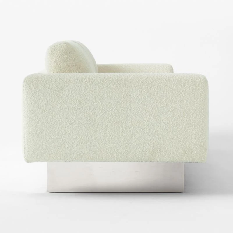 Minimalist sofa by VUUE lets its ’70s-inspired details do the talking. Simple silhouette highlights clean, streamlined angles and plays up mirror-like polished stainless steel base. Cushions offer a deep sit and feel cozy in cream bouclé fabric. CB2 exclusive.