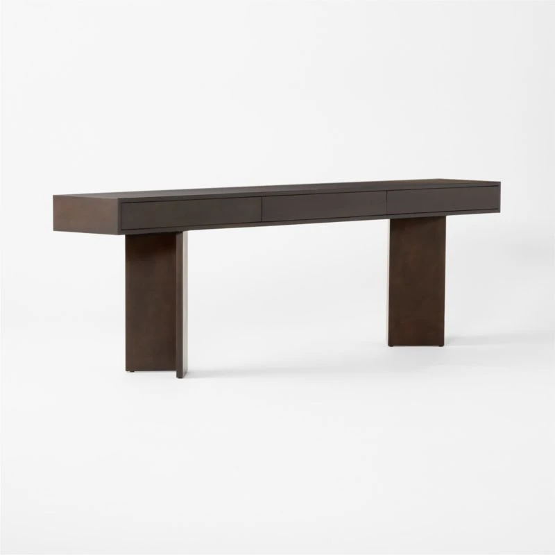 Deceivingly simple at first glance, elongated console table by Studio Anansi explores the possibilities of proportion. The wood frame is fully clad in copper-finished aluminum sheeting to create a slight shimmer when the light hits it just right. It features push-to-open drawers to help maintain order. CB2 exclusive.