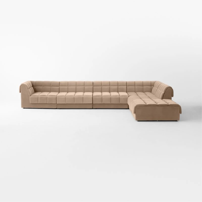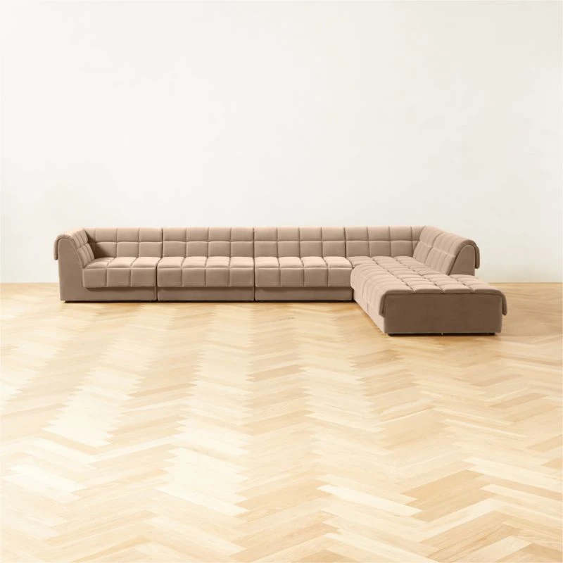 Designed in Barcelona by Mermelada Estudio, plush six-piece sectional sofa has a low profile designed for lounging. Deep, wide ’70s-influenced silhouette evokes the era of conversation pits, with clever construction details such as square tufting and slim cushions that attach to the frame. Upholstered in a gorgeous beige velvet and crafted with solid birch certified sustainable by the Forest Stewardship Council ® (FSC), the modular sectional can be repositioned to suit a variety of seating needs. CB2 exclusive.