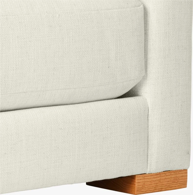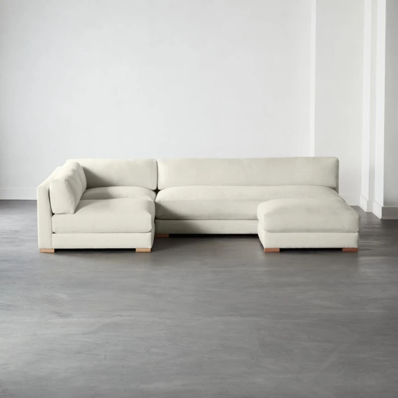 Long, lean, super deep four-piece full sectional lounges low on four solid hardwood feet—an elevated update that appreciates high-end craftsmanship and honest materials. Clean silhouette has a plush, pillowed feel thanks to the improved feather-down cushion design. Soft white linen-blend upholstery plays well against the contrasting hardwood feet. Sectional set includes armless chair, corner chair, ottoman and armless sofa. Can be configured in various ways. CB2 exclusive.