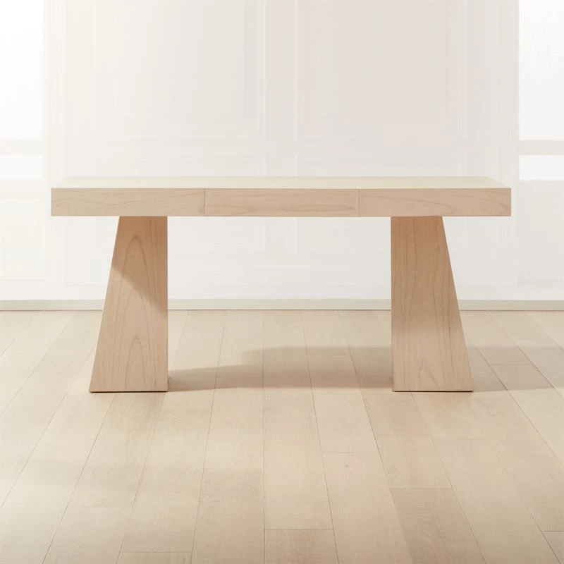 Bleached oak desk designed by Brett Beldock gets the work done in serious style. Made of bleach-stained Mindi wood with a wire-brushed finish, block leg desk flare to the floor dramatically. Single drawer gives desk supplies and private papers a home. Learn more about Brett Beldock on our blog. CB2 exclusive.