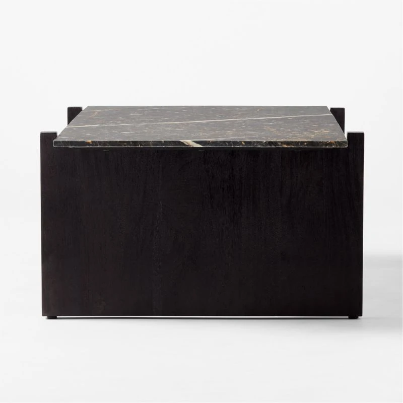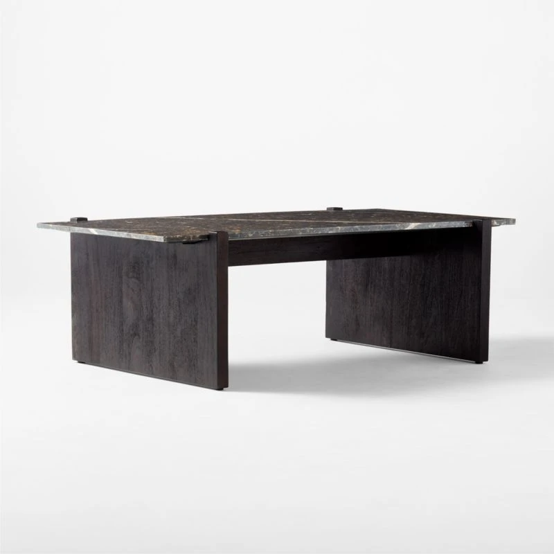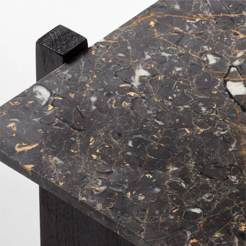 Wirebrushed for texture and finished with a dark stain, two solid acacia wood legs support a solid slab of gorgeous flower marble. Black with white, grey and deep amber veining that looks almost gold. Marble activity is unique to each piece. Designed by Mermelada Estudio. Learn more about Mermelada Estudio on our blog. CB2 exclusive.