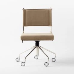 Olive velvet executive chair by Jannis Ellenberger has a chic and commanding presence. High back and cushioned foldover details add to the sophisticated aesthetic, while an iron tube base looks modern in a polished nickel finish. Seat adjusts with tilt-back and gas-lift features to create a comfortable perch for 9-to-5 and beyond. CB2 exclusive.