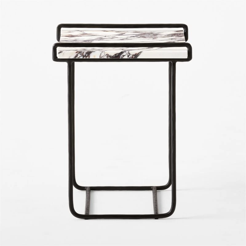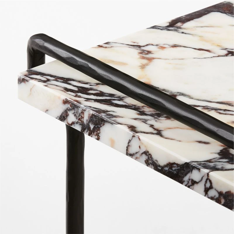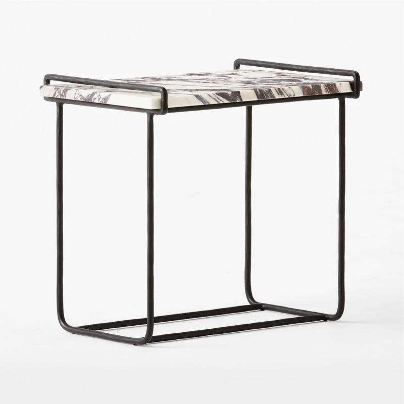 Calacatta Viola marble sourced from Italy is the lavish focal point of this sleek side table by Mermelada Estudio. The solid iron rod base has a matte finish and hand-hammered details—compliment the cream and cabernet hues of the highly active marble top. Due to the nature of marble, each tabletop will be unique. CB2 exclusive.