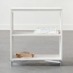 Designed by VUUE, this wood entryway cabinet spotlights the richness of natural materials. Topped with a cool slab of white Carrara-style marble with grey veining and framed by the contrasting warmth of a walnut veneer base. Precisely cut panels angle diagonally to create an abstract chevron pattern of swirling grains and tones on two soft-close doors. Opens to three shelves for storing bags/hats/scarves in the entryway, serveware in the dining room or drinkware and spirits in the living room. Learn about VUUE on our blog. CB2 exclusive.