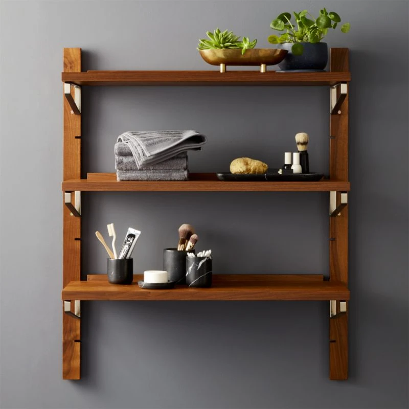 Designed by Leonhard Pfeifer, warm walnut shelves float the wall in modular design. Champagne metal shelf brackets can be slotted at varying heights for the ultimate in flexibility and customization. Need more storage? Just add more single shelves or upright pieces (sold separately). Learn about Leonhard Pfeifer on our blog. CB2 exclusive.
